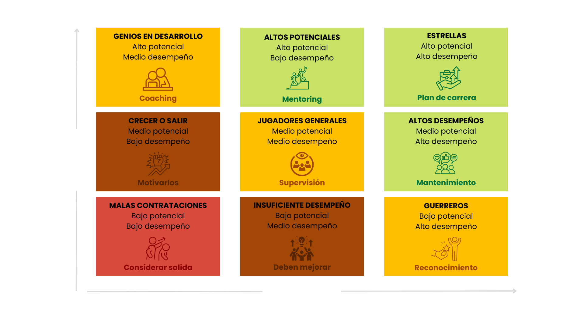 Herramienta de gestión de talento sobre una parrilla de 3×3 cuadrantes que permiten clasificarlo y visualizar su posición con la finalidad de identificar a los talentos de alto potencial, y desarrollar estrategias de desarrollo para cada cuadrante.