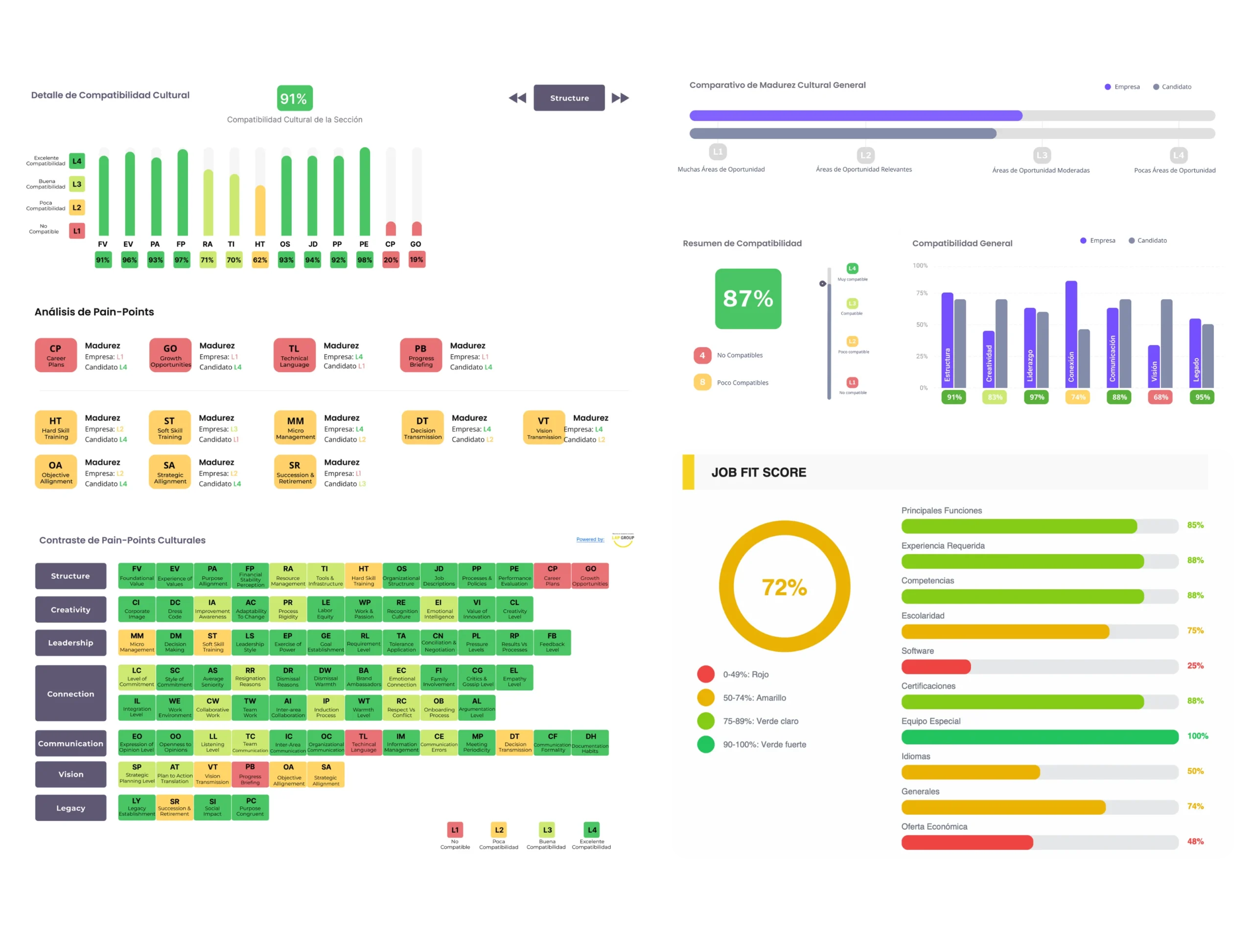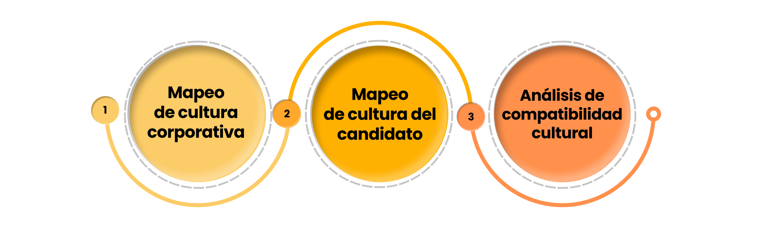 Contamos con el método de mapeo de cultura y análisis de compatibilidad cultural más preciso a nivel global que permite identificar de forma clara el nivel general de compatibilidad que tenga un candidato con la cultura corporativa y los elementos específicos en donde no la haya con la finalidad de tomar decisiones más informadas de contratación.