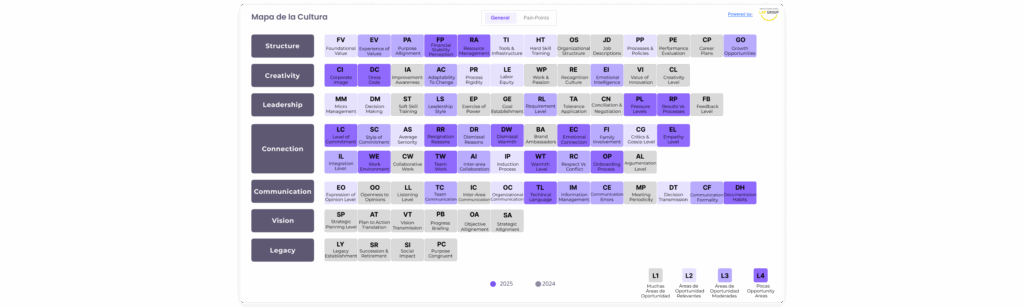 90% de las compañías consideran que la cultura está compuesta por conceptos habituales como lo son Misión, Visión y Valores. Sin embargo, estos conceptos representan apenas el 5% de lo que en realidad abarca la Cultura Corporativa y 98% de las compañías a nivel global no cuentan con herramientas que permitan diseñarla e implementarla.